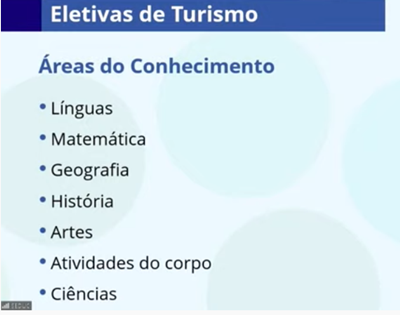 A Secretaria de Educação disponibiliza, na plataforma acessada pelos educadores, a proposta dessas eletivas para o ensino do turismo. Naturalmente os professores poderão optar pela sua adoção total ou parcial, haja vista a necessidade – natural – de se obedecer ao Plano de Ensino de cada um.