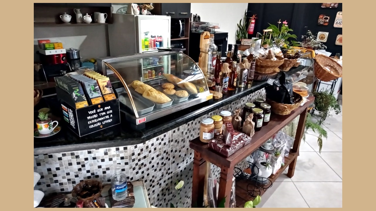 Café caipira; cappuccino; fatias “húúúúngaras”; bolos artesanais; salgados; doces em potes; pães especiais; pão integral com canela e passas ou grãos sortidos; sobremesas; lanches; cachaças artesanais para presentear ou apreciar, moderadamente, em casa...