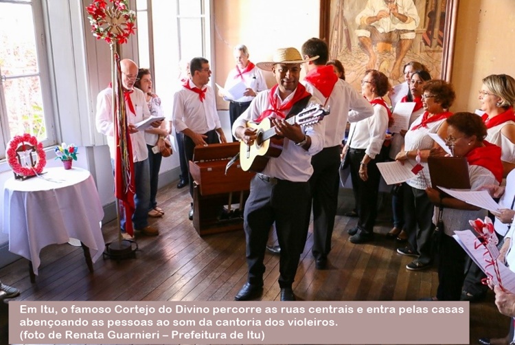A cidade, fundada em 1610, fica a 98 km de distância de São Paulo e promove uma das mais importantes Festas do Divino do interior paulista. Foi a partir de Itu que essa tradição ibérica se disseminou para cidades como Porto Feliz, Tietê, Laranjal Paulista, Piracicaba e Capivari. As festas começam na Páscoa, quando são benzidas as imagens que seguirão pela zona rural para visitar fazendas e sítios, onde se pedem prendas para a festa de Pentecostes. O cortejo solene da Bandeira do Divino percorre as ruas centrais de Itu e entra pelas casas abençoando as pessoas ao som da cantoria de violeiros. Também ocorre, pelas ruas da cidade, o desfile de carros de boi enfeitados com o estandarte vermelho do Divino. Para ir de São Paulo a Itu, percurso de 100 km, deve-se seguir pela SP-280 (Rodovia Castello Branco) até a saída 78 e em seguida a SP-075 (Rodovia Archimedes Lammoglia) até saída 30-A.