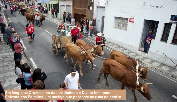 Fundada por bandeirantes no século XVI, Mogi das Cruzes tem uma das mais antigas e importantes Festas do Divino em solo paulista. Já em maio de 1613, o evento é citado em ata da Câmara da então “Villa de Sant’Anna de Mogy Mirim”, como era chamada, à época. Alguns aspectos das antigas festas se mantiveram, como a Entrada dos Palmitos, um cortejo que percorre as ruas do centro, sendo prestigiado sempre por mais de 40 mil pessoas. Com a cor vermelha nos estandartes, há as alvoradas, o Império do Divino, vários grupos folclóricos e uma variedade de comidas típicas. Para ir a Mogi das Cruzes desde a Capital, num percurso de 61 km, deve-se seguir pela SP-070 (Rodovia Ayrton Senna) até a saída 44 e pela SP-088 (Rodovia Pedro Eroles).