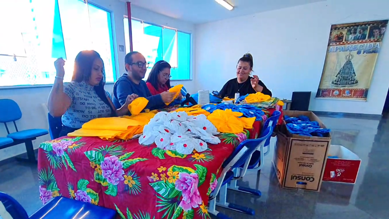 Zenilda Cunha, atual secretaria de Turismo, coordena uma equipe de funcionários da própria pasta na confecção de flores artesanais, de diversos tamanhos e formatos, as quais serão componentes dos elementos de ornamentação para a referida procissão.
