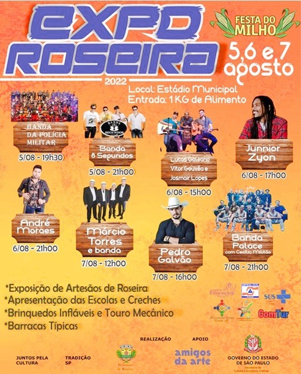 A Prefeitura Municipal de Roseira juntamente com as secretarias de Educação, Saúde, Promoção Social, Esporte e Turismo, além da Defesa Civil, promove, nos dias 5, 6 e 7 de Agosto, a ExpoRoseira 2022.