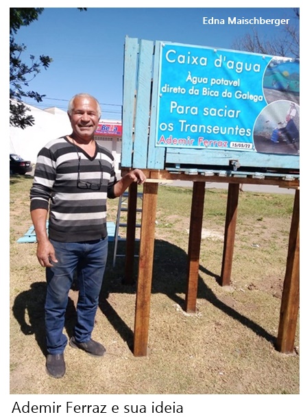 Ferraz nos conta sobre a ideia de fazer alguma coisa para oferecer água aos transeuntes, como consta no banner. Na verdade, pela localização da caixa d’água idealizada pelo cidadão, é um recurso capaz de amenizar a sede de transeuntes e de peregrinos os quais seguem em caminhada até Aparecida.
