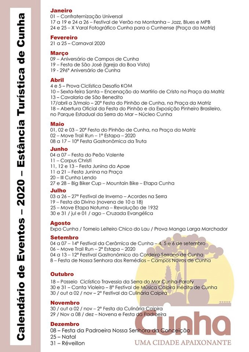 Conhecida pelas suas incontáveis realizações turísticas e culturais, a Estância Climática de Cunha publica, em sua rede social, o calendário de eventos previstos para o ano de 2020.