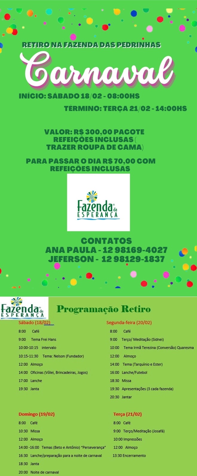A Fazenda da Esperança, no bairro Pedrinha em Guaratinguetá já está atendendo a reservas para mais um excelente Retiro de Carnaval, com quatro dias de atividades muito bem programadas, hospedagem, refeições e a oportunidade de muita apreciação ao amplo espaço de natureza pura por lá existente.