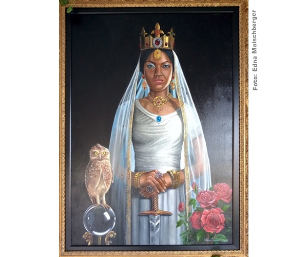 O artista plástico Márcio Carneiro mostrou a primeira de uma coleção de 35 telas com estudos sobre a temática "Ciganos". A tela, em homenagem a Santa Sara Kali, é simplesmente emocionante e a foto clicada pela nossa diretora e fotógrafa Edna Maischberger está ao lado.