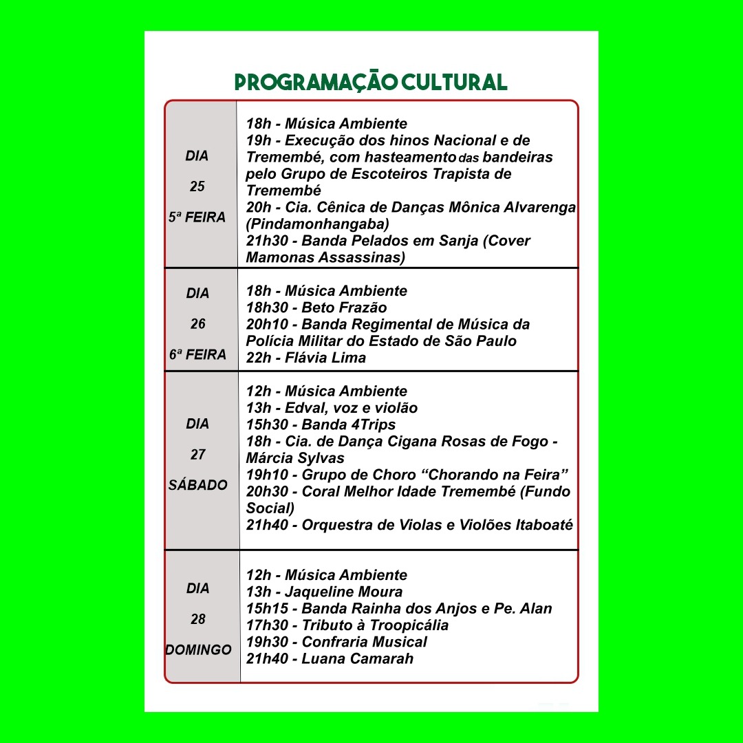 A Banda Regimental da Polícia Militar do Estado de São Paulo, sediada em São José dos Campos, trabalhou seu repertótio bem ao gosto do público, lembrando Alceu Valença, Tim Maia, Roupa Nova, dentre outros. Flávia Lima, excelente cantora faria um show após ao da Banda da PM, cantou duas músicas acompanhadas pelos músicos da PM.