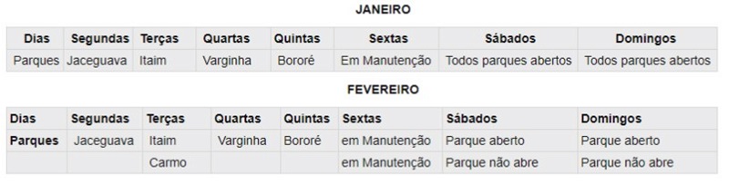 Em janeiro, os parques poderão ser visitados de sábado a quinta conforme tabela abaixo – às sextas, os espaços permanecerão fechados para manutenção. Aos sábados, domingos e feriados, a visitação ocorrerá nos 4 Parques da zona sul. Às segundas, será a vez do Parque Municipal Jaceguava; às terças, PNM Itaim; às quartas, o PNM Varginha, e às quintas, o PNM Bororé. A partir do dia 4 de fevereiro, entra np calendário também o PNM Fazenda do Carmo, da zona leste, sempre às terças-feiras - única data liberada para a sua visitação. Veja: